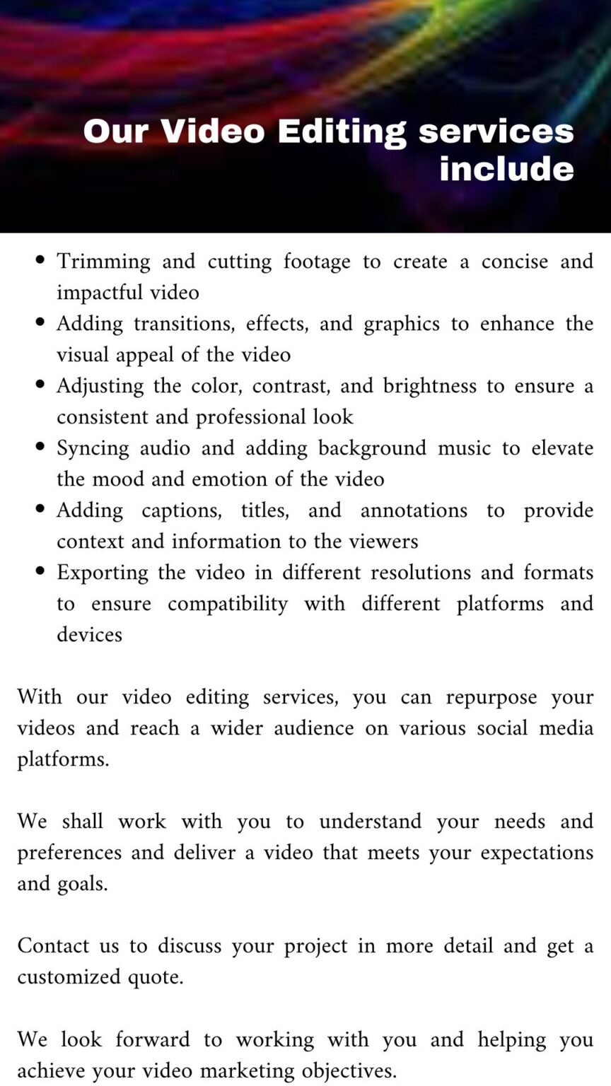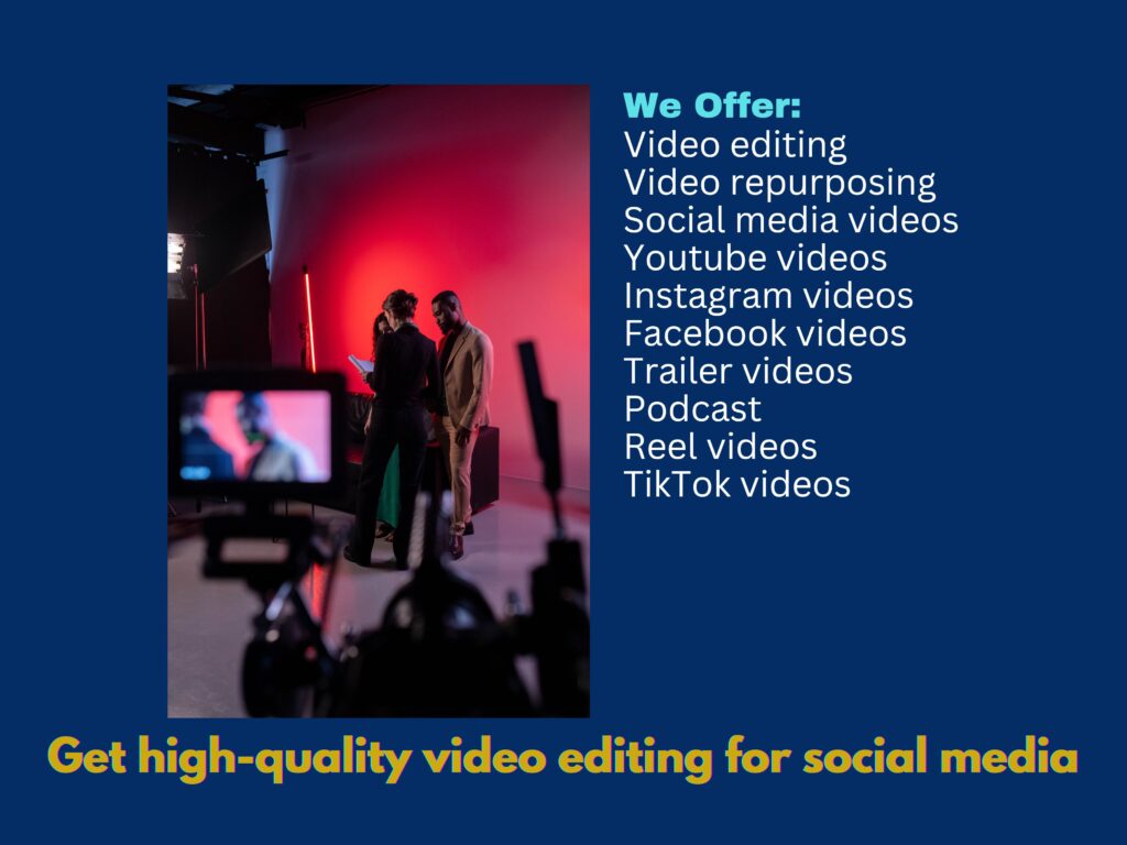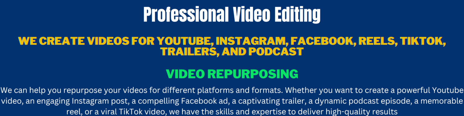 Video EditingRepurposingContent CreationSocial Media book any of our product/service through UPWORK book any of our product/service through FREELANCER book any of our product/service through Fiverr Book/win any of our product/service